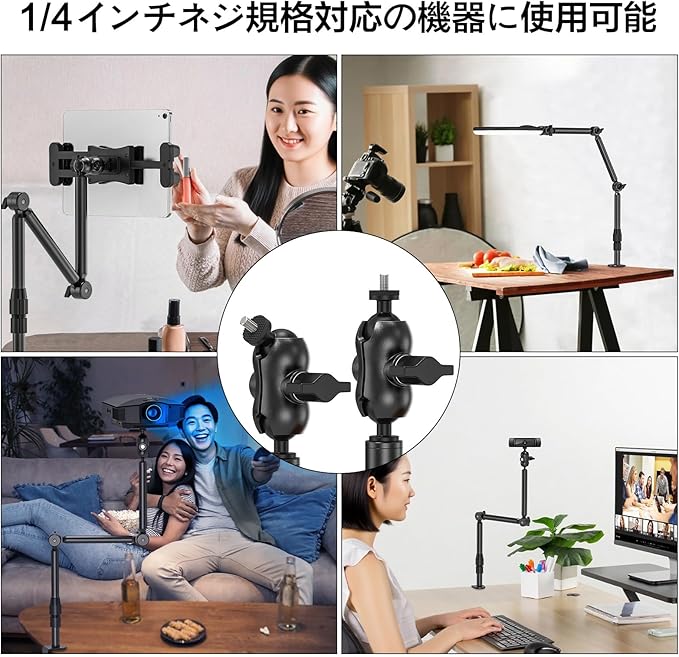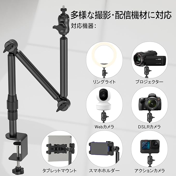 【多機能カメラスタンド】1/4インチネジで多彩な機器を固定。 DSLRカメラやウェブカメラはもちろん、リングライト、LEDビデオライト、プロジェクター、マイクなど、1/4インチネジ規格に対応したあらゆる機材にご利用いただけます。写真撮影や動画録画、ライブ配信、ブログ制作、オンライン授業まで、幅広いシーンで活躍する万能カメラスタンドです。
