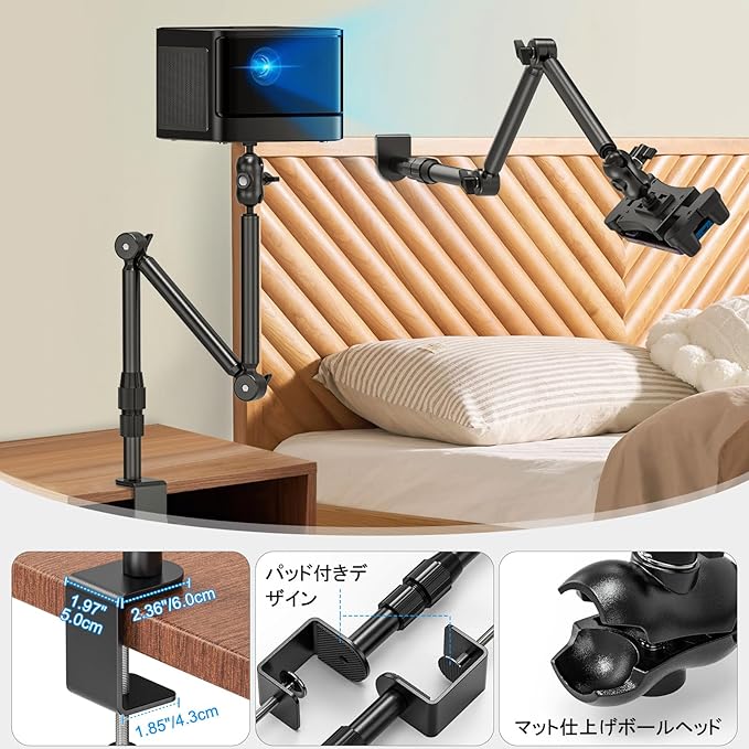 マルチ取り付け設計でどこでも設置】5.79cmまで対応の強力クランプ。 最大5.79cmまでの厚さに対応した調整可能なクランプベースは、保護パッド付きで家具を傷つけません。デスクやテーブルはもちろん、ナイトスタンド、ベッドサイド、キッチンカウンターなど、あらゆる場所にしっかり固定できるカメラスタンドです。