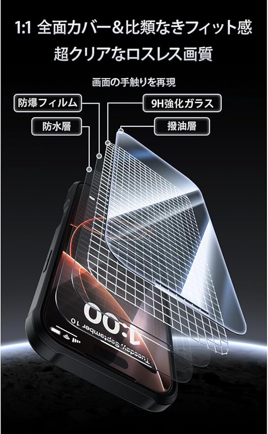 【ガラスフィルム内蔵】高感度スクリーンガラスフィルムはすぐにインストール、気泡やズレなどのトラブルの心配がなく。アイフォン17 Pro Max スクリーンにフィット、カバーとスマホ本体の吸着による水痕の様な密着痕の発生を防ぐため、裏面にはマイクロドット加工されています。