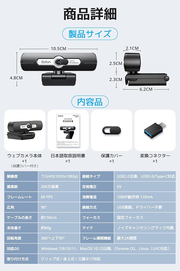 【幅広いデバイスに対応・ドライバ不要】USB2.0/3.0およびType-C接続に対応し、Windows(11/10/8/7)、Mac OS、Linux、Chromebookなど幅広いOSで使用可能な 小型 webカメラ 。ドライバ不要・プラグ&プレイ設計により、差し込むだけですぐに使える手軽さも魅力。 Zoom配信カメラ や 配信用 Webカメラ として、YouTube、Facebook、Teams、Twitchなど多様なプラットフォームでの利用もスムーズな 人気 ウェブカメラです。