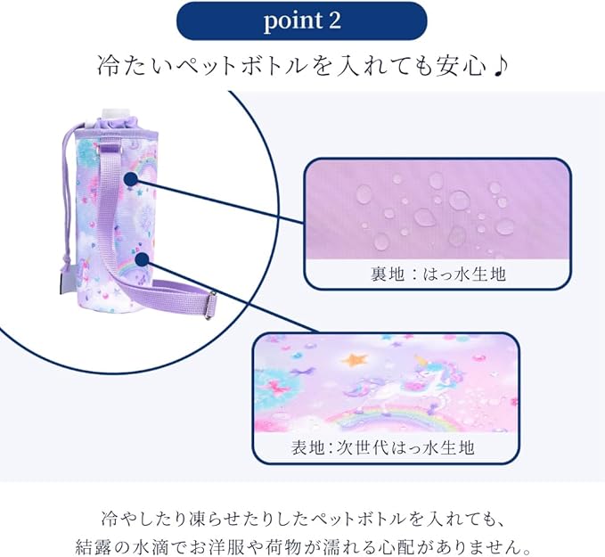 ペットボトルホルダー・水筒ホルダーとしても使える機能性。ペットボトルはもちろん、水筒・ステンレスボトル(500ml・350ml)も収納できます。<br>※直径約7cm・高さ約19cm以下の水筒が収納可能。<br>※高さ19cm以上の水筒は巾着部分からはみ出します。※直径約7cm・高さ約19cm以下の水筒が収納可能。<br>※高さ19cm以上の水筒は巾着部分からはみ出します。