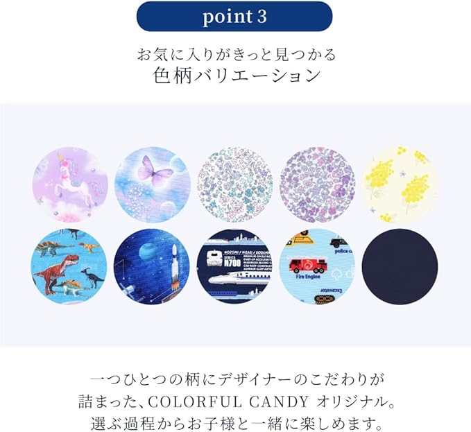 キッズ&ベビー用品のCOLORFUL CANDY STYLE (カラフル キャンディ スタイル) は入園・入学グッズからキッズ向け各種ライフスタイルアイテムまで豊富な色柄をラインアップ。 大切なお子様が「毎日使うもの」を選択するなら、マーケットでひとくくりに「幼稚園児用」、「小学校低学年用」と分類されたものや大量生産のキャラクターだけを選択肢にすることでよいのだろうか、という疑問から当ブランドは始まりました。 お子様一人ひとりの興味や個性、ご家庭の教育方針やご両親の好み・センスは千差万別です。 また、子供の成長の度合いがそれぞれに異なることはママやパパならどなたでも実感されていることでしょう。 毎日こどもが手にするものだからこそ、一人ひとりの個性や発達段階に沿ったものを選ぶべき、と考えます。