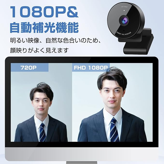 【フル1080p高画質】EMEET C950 webカメラは、1080pフルHDと200万画素の高画質があり、30fpsのフレームレートでクリアかつ滑らかな画面が撮れます。さらに、HD光補正を装備したEMEET C950 WEBカメラは、照明条件に合わせて自動的に画面の明るさを調整して、薄暗い場所でも鮮明な高解像度の画像と明るい画像が撮影できます。