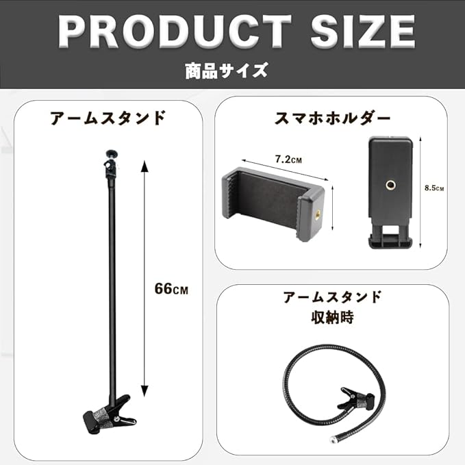 【66cmのロングアーム】長さ66cmのフレキシブルアームを採用しており機器をお好きな高さ、角度に自由にセッティングすることができます。アーム部分は硬めに仕上げており使用中にへたり曲がらない作りとなっております。