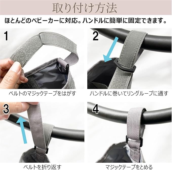 【安定した取り付け】 ほとんどのベビーカーに対応 ハンドルに簡単にしっかり固定でき、走行中も安定感があります