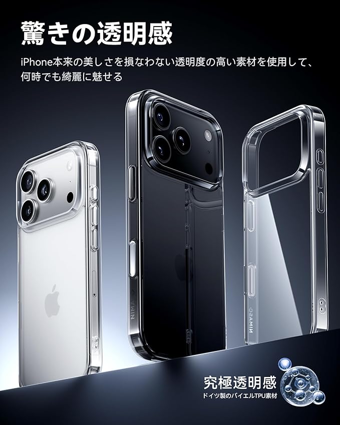 【黄変防止強化材質】高品質PC素材とドイツ製のバイエルTPU素材を使用し、iPhone 17Pro Maxの美しさを損なうことなく、スマホ本来の美しさ保ちます。TPUポリマーに添加されたUV剤が黄変防止を大幅に向上させ、長期間使用しても光沢と透明感を維持することができます!また、ワイヤレス充電にも対応しているので、急速充電も可能です。あなたの生活をより便利にまた快適にします。