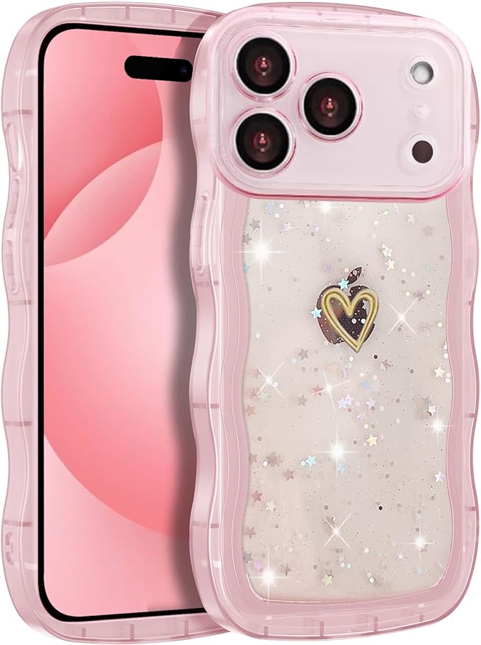 iPhone 17 Pro Max 用 ケース クリア キラキラ 可愛い ハート形 TPソフト 透明 かわいい 韓国 薄くて軽い 人気 おしゃれ ストラップ穴あり 落下防止 耐衝撃 保護カバー スマホケース (iPhone 17 Pro Max 用,ピンク)