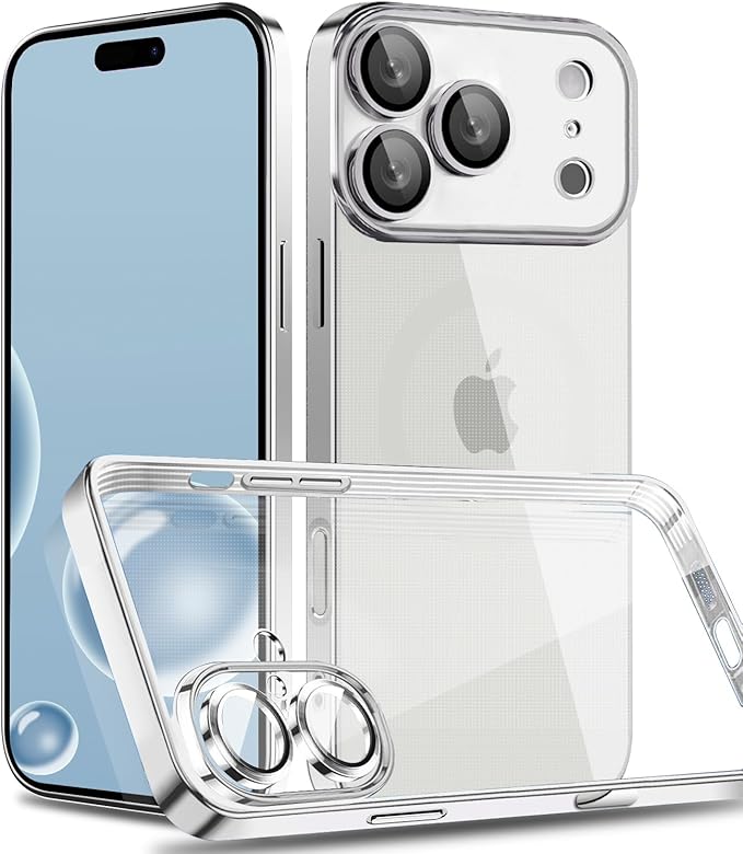 iPhone 17 Pro Max 用 ケース クリア メッキ加工 レンズ保護 TPU ソフトケース 薄くて軽い 人気 耐衝撃 黄変防止 携帯カバー アイフォン 17 Pro Max 用 クリアケース (iPhone 17 Pro Max用,シルバー)