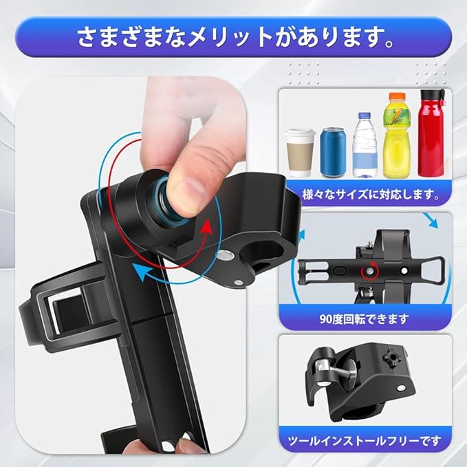ドリンクホルダー カップホルダー 自転車カップホルダー 自転車 ボトルケージ ボトルホルダー 自転車用ボトルホルダー 簡単取付 360度回転 超軽量 サイズ調整可能 ウンテンバイク ロードバイク クロスバイクに最適 ベビーカーにも 黒