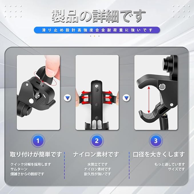 360 回転デザイン:自由に角度を調整することができます クランプの側面にある調整スイッチを回して直径を調整します 直径を調整した後、調整スイッチを固定してください。
