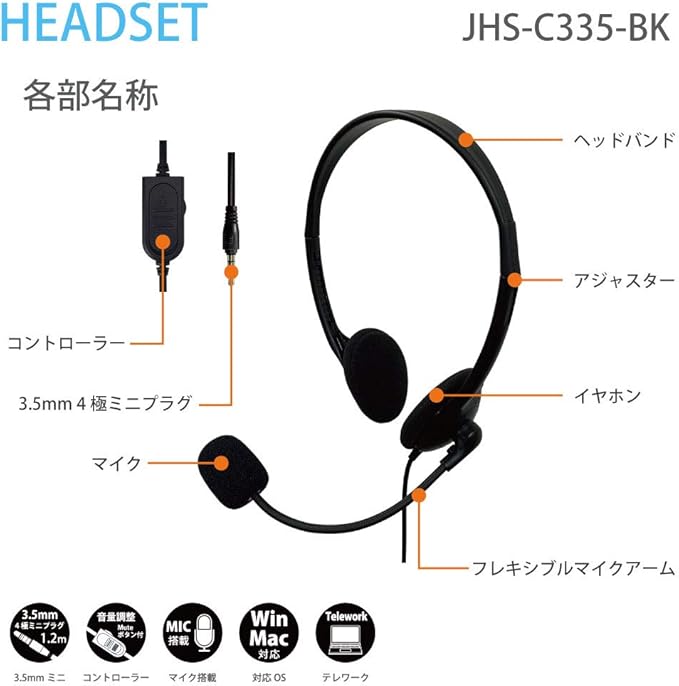 コンピュケースジャパン ヘッドセット マイク付き 軽量 4極ミニジャック 両耳 オーバーヘッド 1.2m テレワーク Web会議 JHS-C335-BK