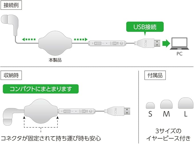 コンパクトに収納できて持ち運びに便利。手元コントローラーで操作可能なUSBタイプの巻取り式片耳イヤホン