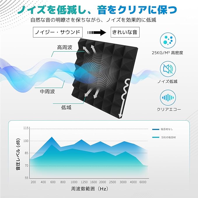 [高性能吸音材] 吸音材は高密度の高品質ポリウレタンフォーム製で、タワー型に精密にカットされた表面が多方向からの音波を吸収・散乱させ、反響音や不要なバックグラウンドノイズを大幅に低減し、よりクリーンで焦点の合ったサウンド環境を実現します。 楽器室、レコーディング・スタジオ、コントロール・ルーム、放送局などに設置し、室内の音響をコントロールするのに最適です。