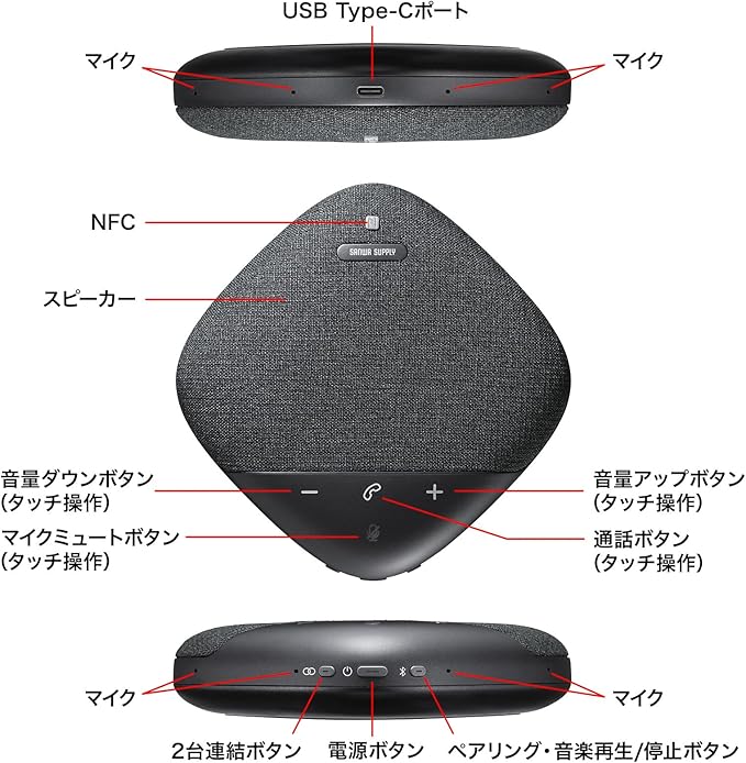 サンワサプライ Bluetooth 会議スピーカーフォン 8マイク搭載 8W出力 360 集音5m 2台連結 Windows/Mac対応 MM-BTMSP5