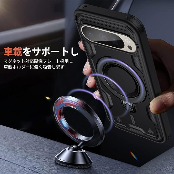 スタンド機能:嵌め込み構造により、しっかり本体を支え揺れなし。マグネット式車載ホルダーに対応して。ケースを横置きにするとスタンド機能になり、持たず動画鑑賞などを楽しむことができます。リングはケースにしっかり固定されていて、縦置き、横置きどんな角度でも固定できます。