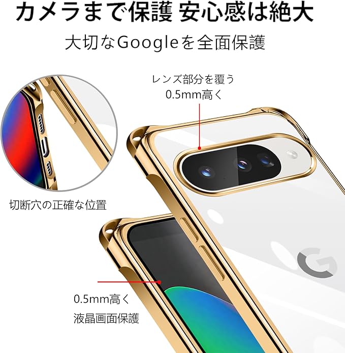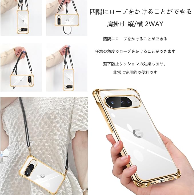 Google Pixel10 ケース クリア ネック ショルダー グーグルピクセル10 カバー 耐衝撃 対応 Pixel 10 Pro スマホケース 肩掛け 斜めかけ 縄掛け カバー メッキ加工 透明 TPU 薄軽型 ストラップ付き 携帯ケース ネックストラップ ショルダー 肩掛け 長さ調整可能 取り外し可能 落下防止 擦り傷防止(ゴールド)
