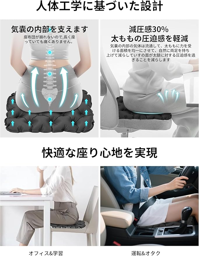 【基于人体工学的设计】好みに合わせて空気の量を調整でき、硬さや厚みを自由にカスタマイズ可能。人間工学に基づいたデザイン、隙間を増やし蒸れ、熱こもり軽減!地面からの熱さ冷たさを遮断してくれて快適です。厚み約5cmあり、体圧を均等に分散、快適な着座姿勢を提供し、臀部をしっかりとサポートする。