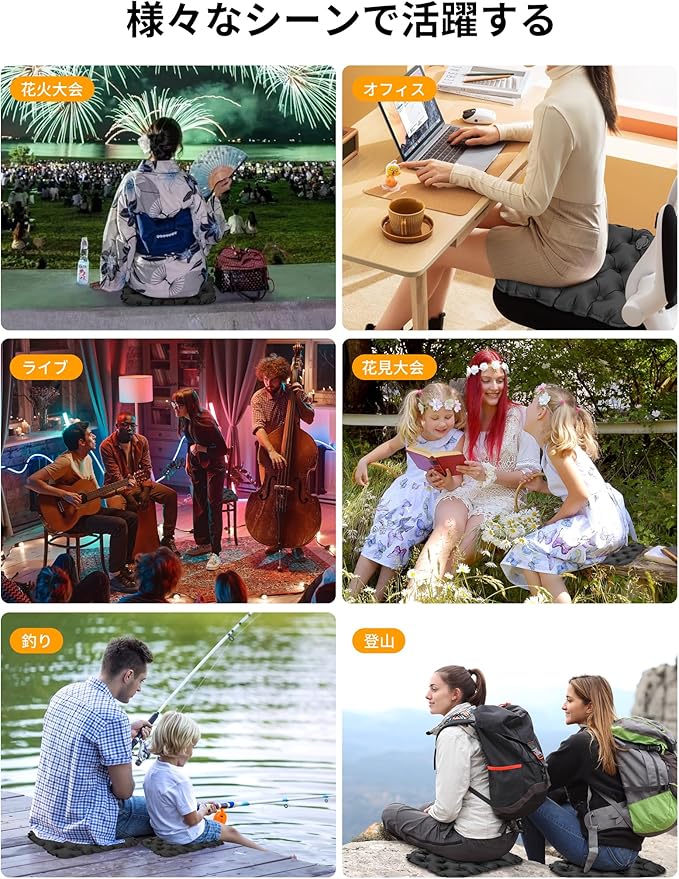 【あらゆる場面で活躍】旅行時の飛行機、長距離バス、新幹線ではもちろん、仕事や家でのリラックスタイムでもお使いいただけます。ミニ座布団や携帯座布団としても重宝し、アウトドア座布団や飛行機クッションとしても活用可能。旅行 便利グッズ、アウトドア、野外ライブやスポーツ観戦、釣りなどの幅広いシーンにに最適なエアー座布団です。自分用や、プレゼントとして家族や友人に差し上げるといいでしょう。