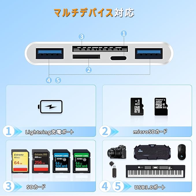 【iPhone SDカードリーダー 5in3】このLightning SDカードリーダーは、4種類の機能別ポート(SDカードポート、microSDカードポート、lightningポート、USB 3.0ポート)を装備。カメラからの写真転送、機種変更時のデータ移行、ファイル保存、音楽鑑賞、動画視聴、その他周辺機器とのUSB接続など、日常生活で幅広くお使いいただけます。
