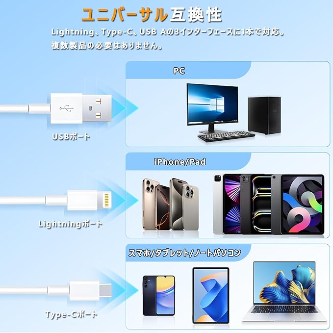 【広範な互換性】このUSB/SD/TF変換アダプターは、Type-CポートやLightningポートを搭載したiPhone/iPad/Android/Windows/Macなどの各種デバイスと互換性があります。対応規格:【SDカード: SD/SDXC/RS-MMC/MMC/Extreme SD/Ultra SD UHS-I。microSDカード: microSD/microSDHC/microSDXC。USB 3.0: USBフラッシュドライブ、デジタルカメラ、マイク、キーボード、電子キーボードなど。USB-C (Type-C): Type-Cフラッシュドライブ、充電器など。】【注意:本製品のType-CインターフェースはiPhoneには対応しておりません。】