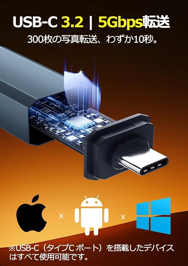 【高速データ転送&OTG対応】USB3.2規格に対応しており、最大5Gbpsの高速転送と双方向通信に対応し、大容量ファイルもスムーズに扱えます。UHS-Iカードに対応し、ファイル、写真や動画など大量のデータを数秒で転送できます。また、このiPhone sdカードリーダー タイプcは、OTG機能が搭載で、パソコンがなくても、デジタルカメラで撮影した写真をスマートフォンとSDカード間で簡単に転送できます。あなたの時間を解放する、究極のデータ転送マシン。