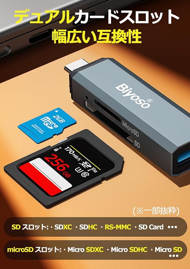 メディアタイプ SDXC,SDHC,SD,MMC,RS-MMC,microSDXC,microSDHC,microSD,USB, USB 2.0タイプ A, USB 3.0タイプ A