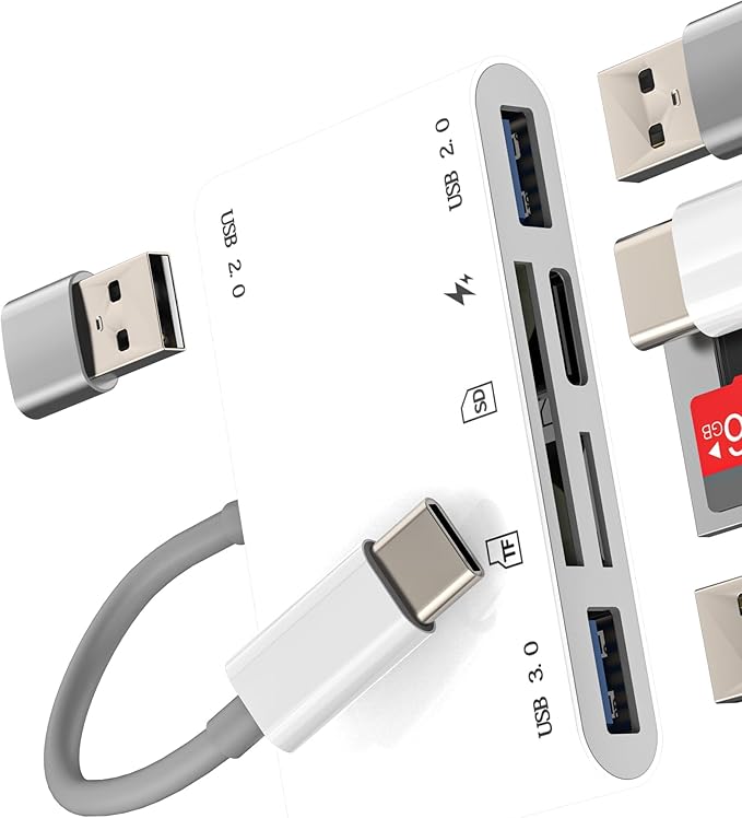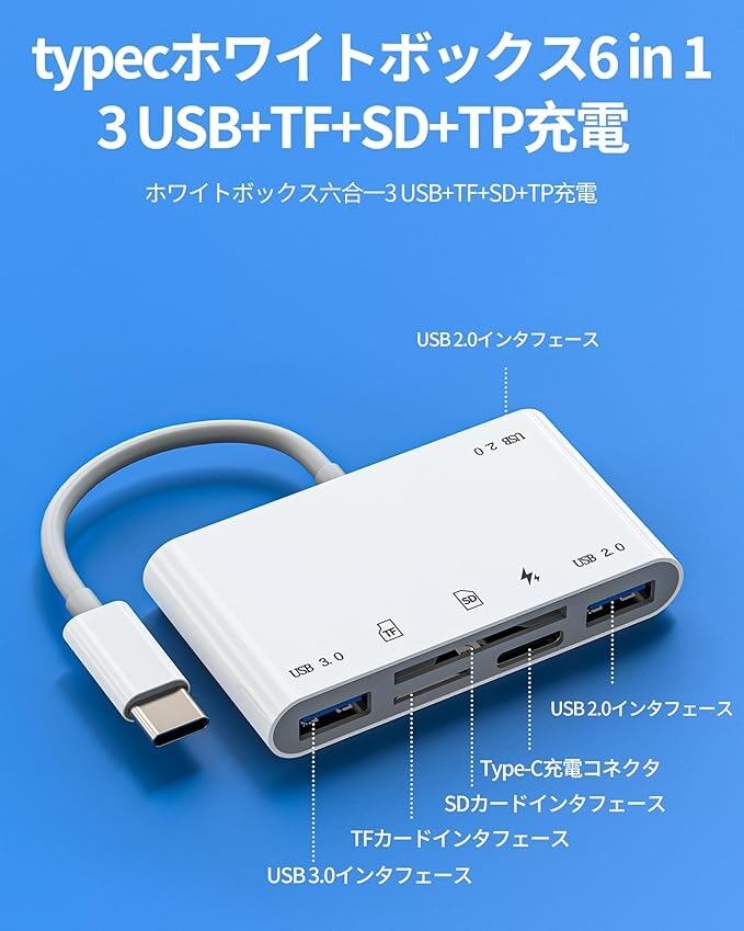 USB C 6-in-1アダプターは、データ転送とデバイス充電を素早く効率的に行いたい方にとって最適なソリューションです。SDカードおよびMicro SDカードリーダー、キーボード・マウス・ヘッドホンなどを接続できる3つのUSB-Aポート、高速充電に対応したUSB Cポートを1つ搭載し、すべての機能を1台に集約した多機能アダプターです。最大30MB/sの転送速度により、カメラやメモリーカードからUSB-Cデバイスへの写真や動画の高速転送が可能です。さらに、充電しながらのファイル転送にも対応しており、マルチタスクを簡単かつ効率的に実行できます。耐久性のあるABS素材を使用し、コンパクトで携帯性に優れており、日常使用にも対応。対応iPhone 16、15 Pro Max、対応iPad、対応Samsung Galaxy S25/S24/S23/S22など、幅広いデバイスとの互換性があります。追加のソフトやドライバーは不要で、接続するだけですぐに使用できます。