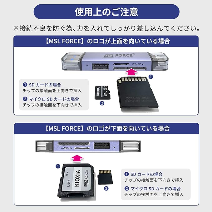 【使用上のご注意】 ・こちらの商品はTypeCの端末には対応しておりますがLightningには対応しておりません。※変換アダプタを使用されても使用できない可能性がございます。・こちらの商品はカードリーダーです。ご使用頂くにはSDもしくはmicroSDカードが必要です。本製品にSDカード、microSDカードは含まれておりません。・本製品の【MSL FORCE】ロゴを上向きにして差し込みしてください。・SDカードを挿入する際はチップの接触面を下向きにして挿入してください。・マイクロSDカードを挿入する際はチップの接触面を上向きにして挿入してください。