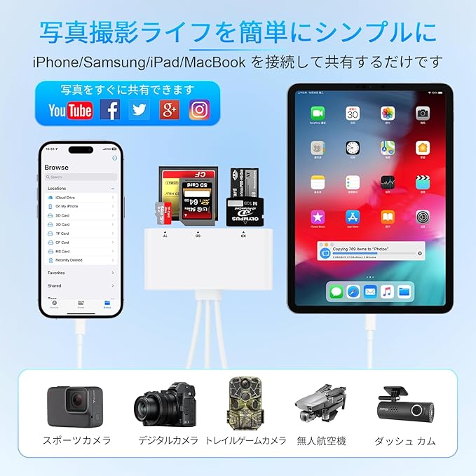 【ユニバーサル互換性】3 in 1 Lightning/USB C/USB A 3.0設計ポートを搭載。このSD/TF/CF/Micro SD/XD/MS USB Cカードリーダー iphone、iPhone 15 14 13 12 11 Pro/Pro max/Plus/Mini/XR/X/XS/XS Max、Samsung Galaxy S24/S23/S23+/Ultra/S22/S21/S20/S10/Z Flip4/Z Fold4、MacBookシリーズ、Mac-Book Pro、ChromeBook、Dell XPS、Androidフォン、iPad Proシリーズ、Sony XPERIAシリーズ、Google Pixelシリーズと幅広く互換性があり、追加のドライバーは必要ありません。
