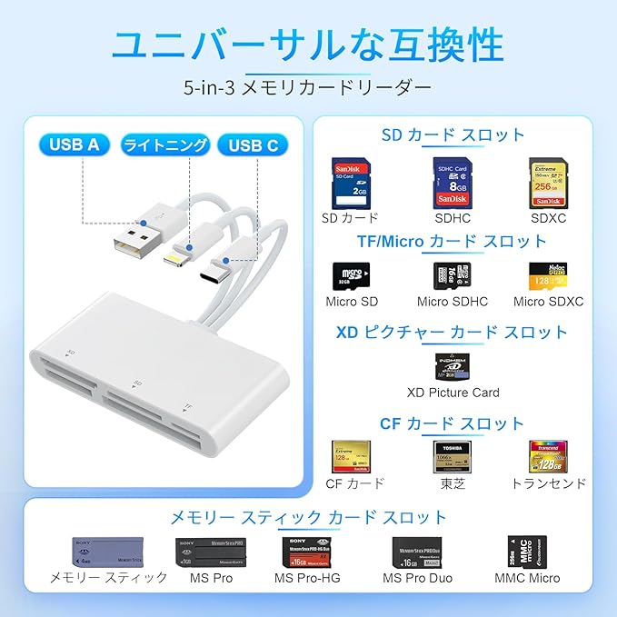 【2025新安定高速版】SDカードリーダーメモリーカードリーダー, 5 in 3 Lightning/Type C/USB-A から SD/TF(Micro SD)/CF/Micro SD/XD/MS カードリーダー 双方向 高速転送 メモリーカードリーダー iPhone, Samsung, MacBook Pro/Air, iPad, Android スマホ, ピクセル, PCに対応