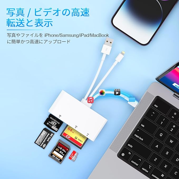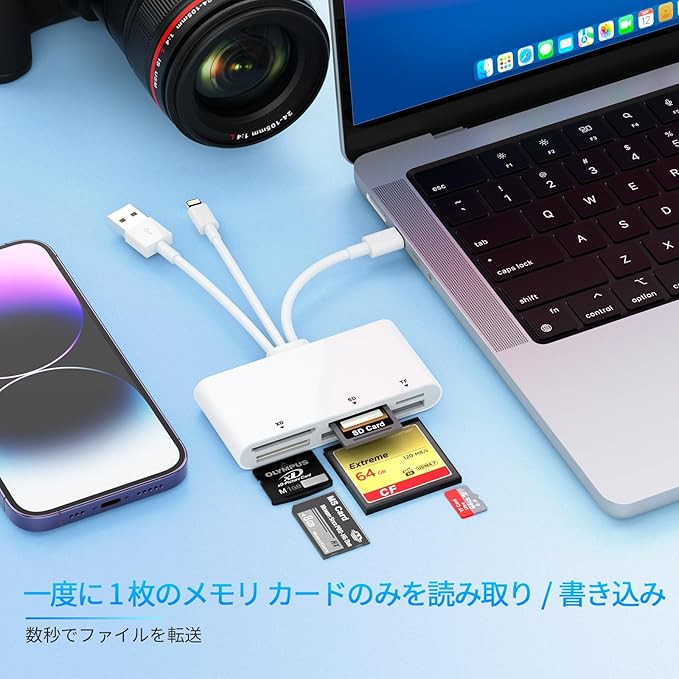 【高安定性データ転送】iphone sdカードリーダーは最大480Mbpsのメモリカードをサポートし、高解像度のHDムービー、画像、ビデオ録画をより高速かつ効率的にコンピューターに転送します。このユーザーフレンドリーで効率的なUSBカードリーダーで、さらに高速なデータ転送をお楽しみください。