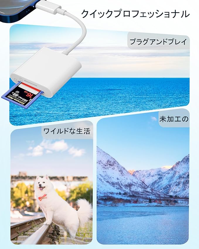 撮る愛好者に最適:このSDカードリーダーはコンパクトで軽量なデザインで、軽量でスペースを占めていません、旅行や毎日の撮影に最適です。いつでもどこでも写真やビデオをデバイスに転送でき、すぐにソーシャルメディアで共有でき、持ち運びも簡単なので、録画愛好者へのちょっとしたプレゼントにもなります。 また、スマートフォンのメモリが少なくなってきたら、写真の一部をSDカードに保存しておけば、スマートフォンのデータを何度も消去することなく容量を空けることができます。