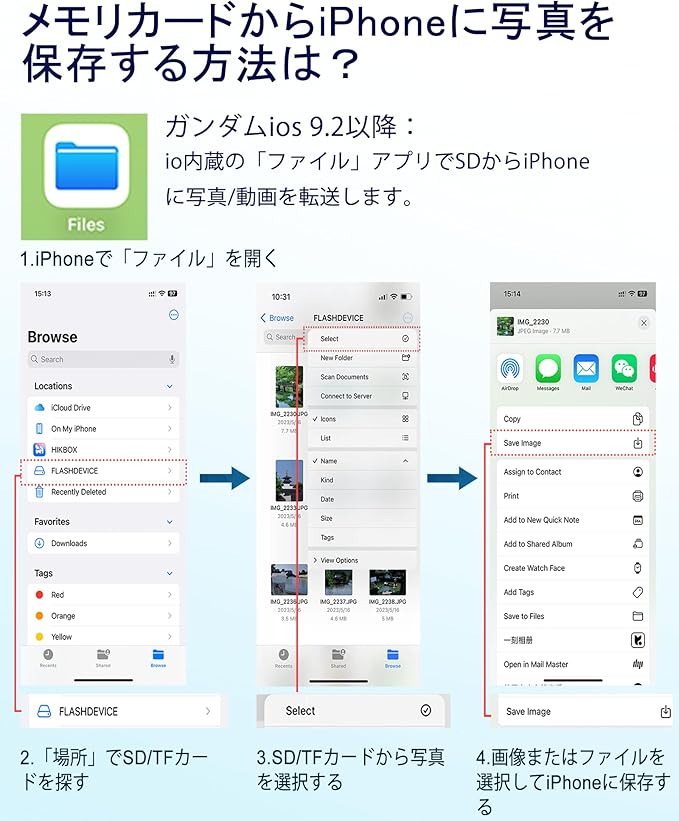 プラグプレイ:このLightning - SD/TFカードアダプタは、サードパーティの接続アプリ、ネットワーク接続、追加のハードドライブやソフトウェアを必要とせず。手持ちのSDカードやMicro SDカードをカードリーダーに挿入し、スマートフォンに接続するだけで簡単に使用できます。転送速度は30 MB/秒~50 MB/秒です。iPhone SDカードリーダーをデバイスに接続し、カード挿入後わずか5秒のレスポンスタイムで、共有の瞬間を始めることができます。