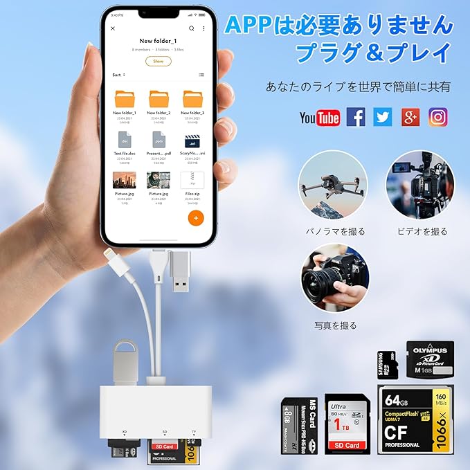 【双方向コピー対応】AppleとAndroid、およびPCデバイスは双方向データ転送をサポートしています。iOS13以降では、SDカード→iPhoneだけでなく、iPhone→SDカードへの書き込みも可能。旅行や撮影後のバックアップに最適。