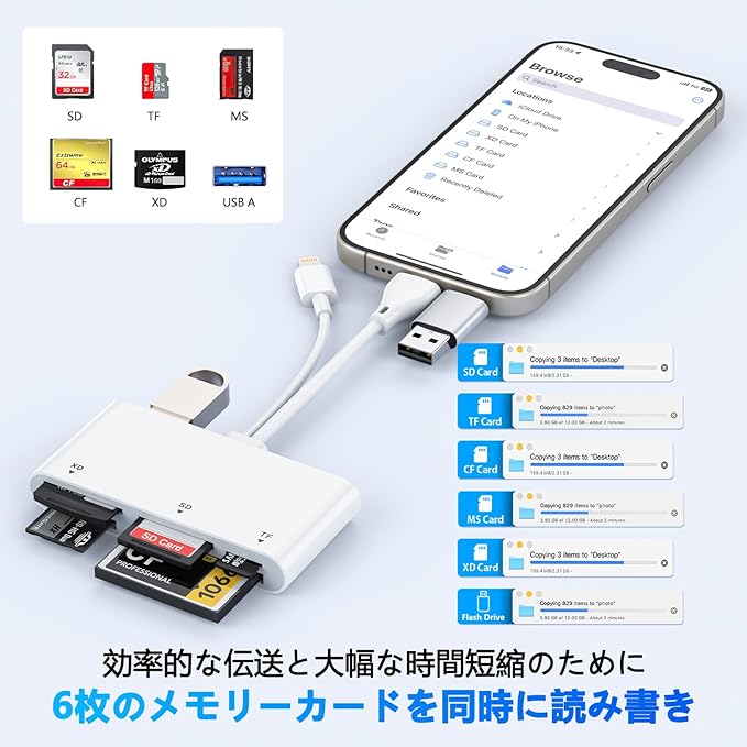 【2025年 MFi認証】 6in1 SDカードリーダー iPhone/iPad/Android/PC対応 Lightning/USB-C/USB-A - SD/TF(Micro SD)/MS/XD/CF/Type-A カードリーダー 高速転送 最大2TB対応 写真・動画・データ移行 双方向コピー