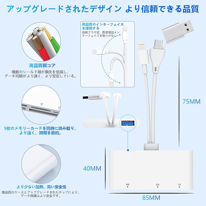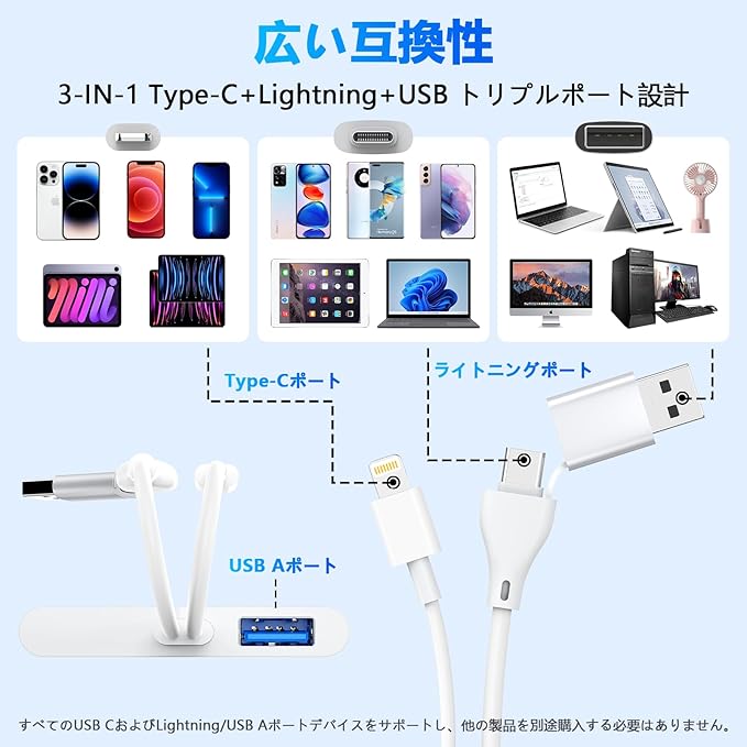【幅広い互換性】3in1メモリーカードリーダーは、市販のスマートデバイスの99.99%に対応しています。Lightning端子(iPhone/iPad)、USB-C端子(Androidスマホ/タブレット、MacBook)、USB-A端子(Windows PC)に対応。これ1台で複数デバイス間のデータ移行が可能。