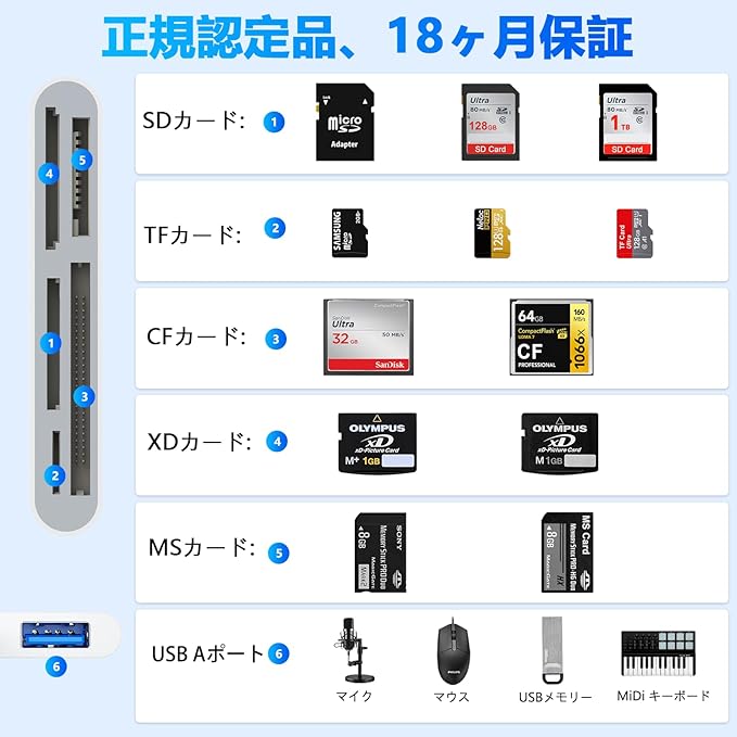 【大容量2TBまで対応】SD/SDHC/SDXC/microSD/xDピクチャーカード/メモリスティックプロ/CF(Compact Flash)/カードに対応し、最大1TBまでの大容量カードをサポート。プロのカメラマンや動画編集にも安心。