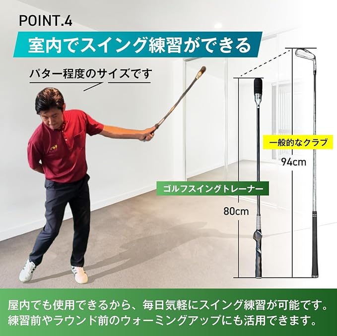✅【室内でスイング練習ができる】屋内でも使用できるから、毎日気軽にスイング練習が可能です。練習前やラウンド前のウォーミングアップにも活用できます。※一般的なクラブの長さ94㎝に対して、当商品は長さ約80㎝です。
