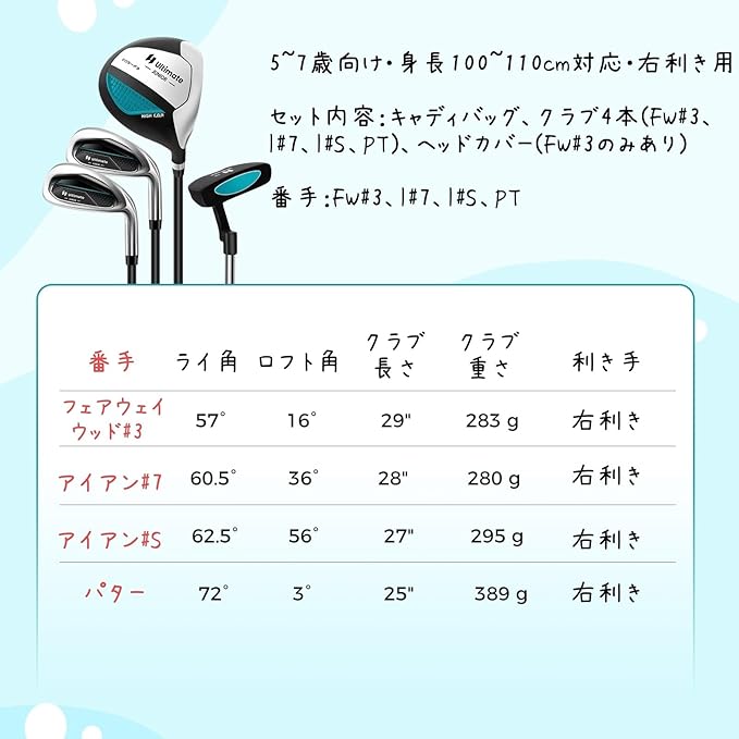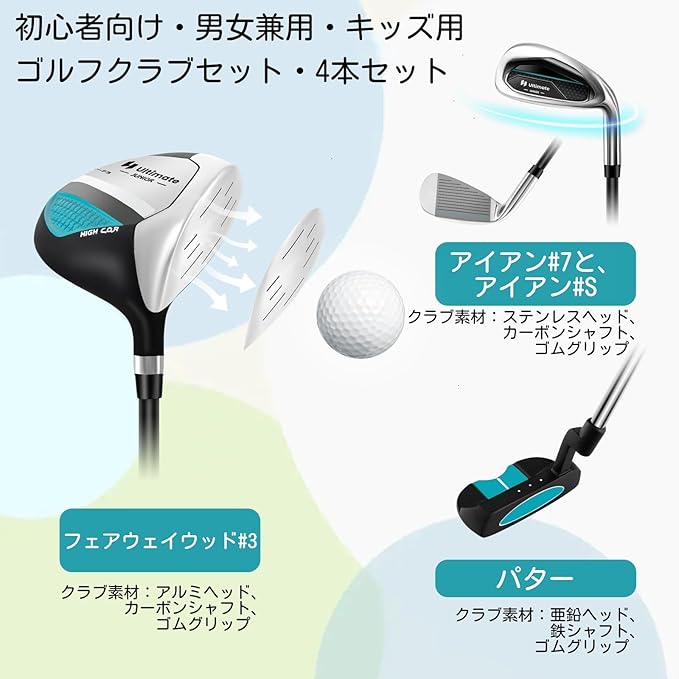 ⭐セット内容:キャディバッグ、クラブ4本セット(FW#3、I#7、I#S、PT)、ヘッドカバー(FW#3のみあり)