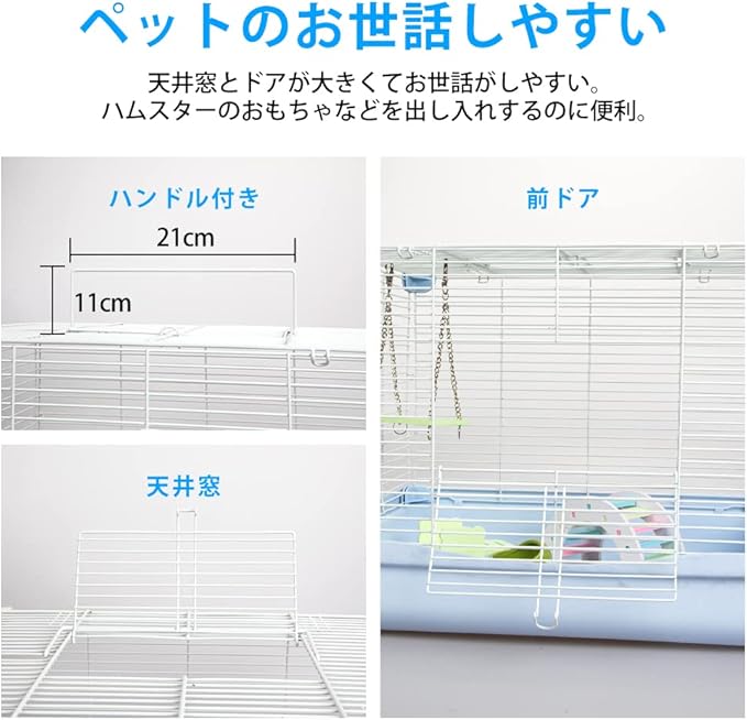 【お世話しやすく、広いケージ】おもちゃ等を置いても広々としています。天井窓とドアが大きくてお世話がしやすい。ペットのおもちゃなどを出し入れするのに便利です。