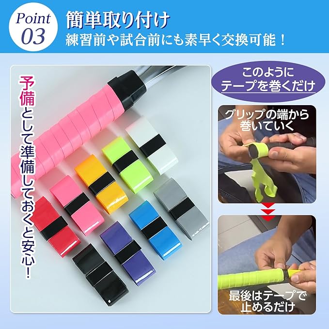 頻繁な交換が必要な方や、部活動などで多くのグリップテープを使用される方に最適な、お得なセット商品です。まとめてご購入いただくことで、1本あたりのコストを抑えつつ、常に快適な使用感を保つことができます。消耗の早いスポーツシーンにおいて、コストパフォーマンスに優れたこのセットは、経済的でありながら品質にも妥協しません。ストックとしても安心のボリュームで、必要なときにすぐに取り替え可能。使うたびにその実用性を実感できる、日々のトレーニングや試合に心強い味方となるセットです。