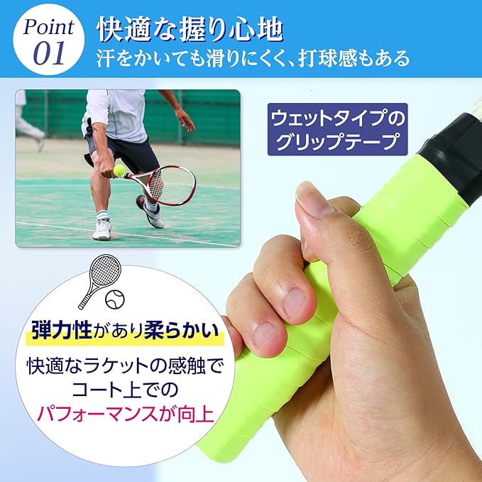 汗をかくシーンでも安心してプレイに集中できる、ウェットタイプのグリップテープです。優れた吸湿性により、手にしっかりとフィットし、滑りにくい設計で快適な握り心地を実現。ラケットとの一体感を高め、安定したスイングをサポートします。程よいクッション性と密着感により、力強くもしなやかな打球感が得られ、プレーの質をさらに高めてくれる逸品です。長時間の使用でも手の疲れを軽減し、競技においても日常の練習においても、あらゆるプレーヤーに信頼される性能を備えています。