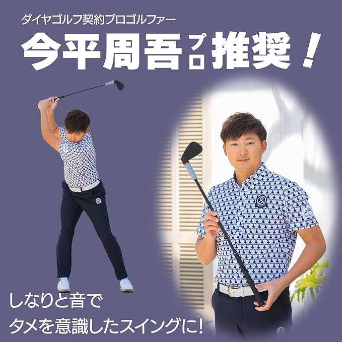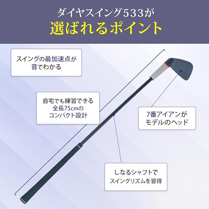 「しなる」シャフトと最加速点で音が鳴る機能で、スイングリズムが習得できる全長75cmのスイング練習器具です。