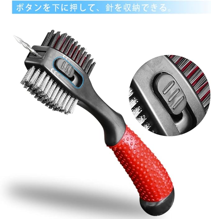 ゴルフクラブブラシ 清潔用 メンテナンスツール ワイヤ ナイロン 針収納可 三面 伸ばせるひも カラビナフック付き 滑り止めゴムのハンドル 携帯便利 軽量 多用途 レッド