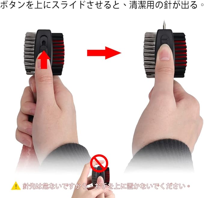 【改良版】:改良前には針のボタンを使用時にスチールブラシで刺されやすい、改良した後ナイロンブラシとスチールブラシが逆にのため針のボタンを使用時にスチールブラシで怪我をすることはありません。