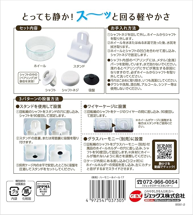 【スタンドを使用して設置】回転輪のシャフトをスタンドの穴に差し込み、シャフトを90度回して固定します。スタンドの底裏、又は背面裏に吸盤を取り付けます。飼育ケージ内の水平で安定したところに吸盤を圧着してスタンドをセットしてください。【ワイヤーケージに設置】回転輪のシャフトをケージにワイヤーの間に差し込み、90度回して固定します。【グラスハーモニー(別売)に設置】回転輪のシャフトをグラスハーモニー(別売)付属品のホイールホルダーの穴に差し込み、シャフトを90度回して固定します。ケージ内側の背面にある差し込み口(2ヶ所)にホイールホルダーの突起を差し込み、左にカチッと音がするまでスライドさせます。