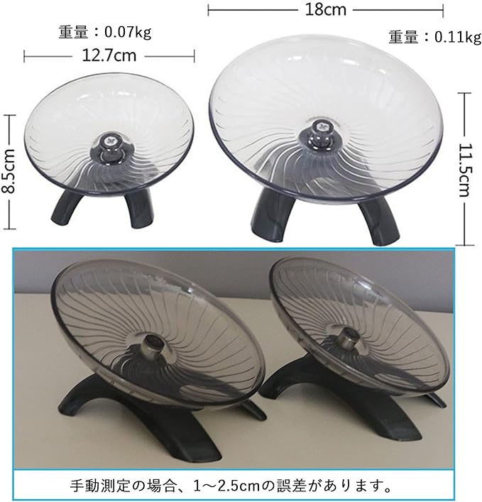 【ハムスター 回し車のサイズ】S:12.7*12.7*8.5cm、重量:0.07kg。L:18*18*11.5cm、重量:0.11kg。おしゃれなグレーです。かわいく見えます。円盤自体が若干斜めになるように作られてますので、均等に左回り右回りと遊んでくれればいい。ハムスターフライングソーサー、小動物に理想的な遊び場です。