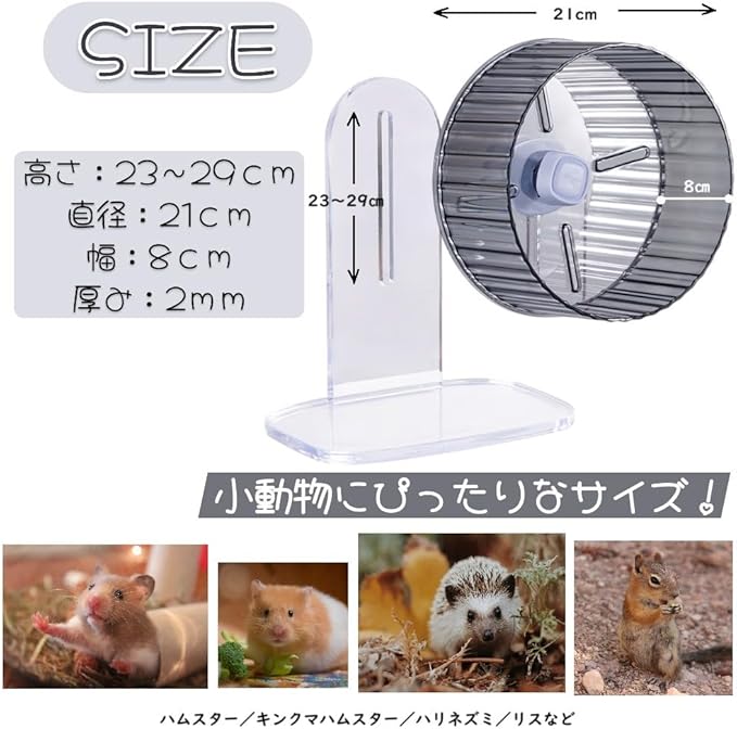 小動物用の回し車として最適な静音設計された安定感のあるサイレントホイールです。しっかりとしたクリスタルカラーホイールとアクリルスタンドのセット商品になります。ハムスターなどの様々な小動物に対応しています。大きめの回し車ですので人気のキンクマハムスター用にも適しています。