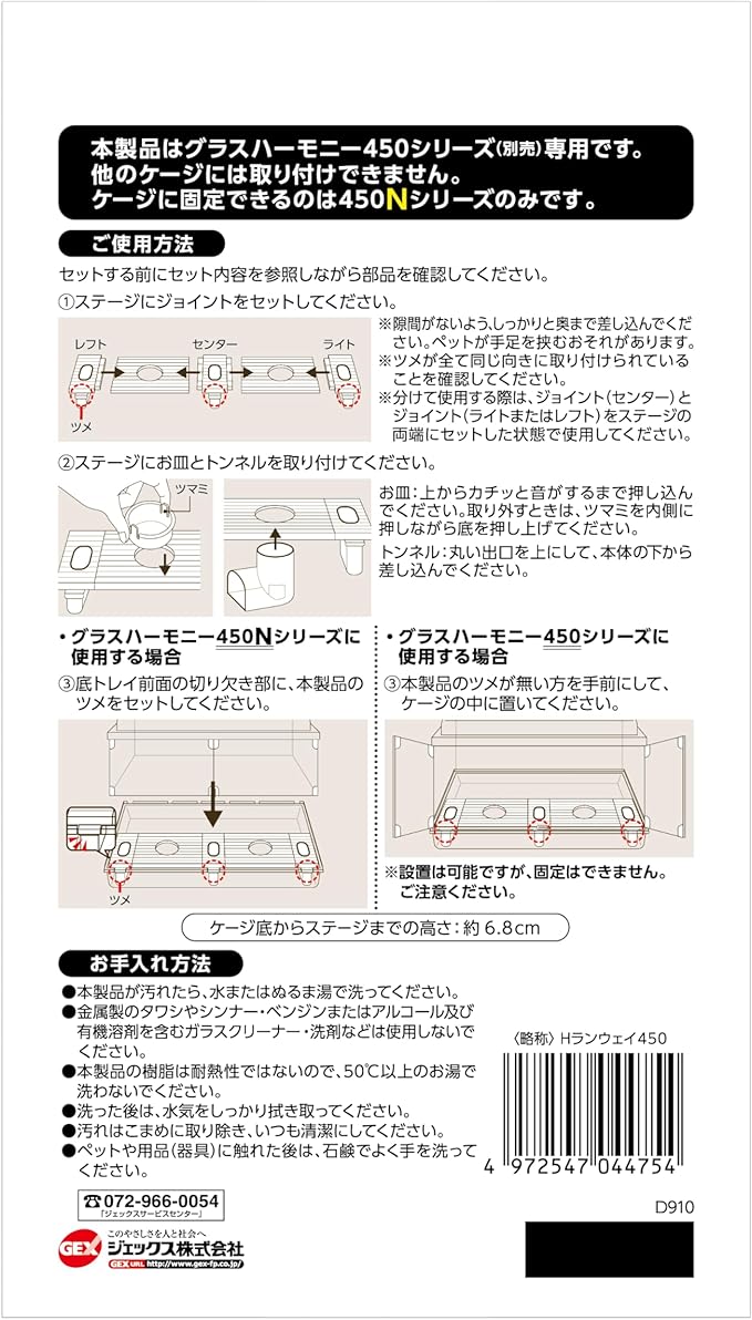 1.ステージにジョイントをセットしてください。2.ステージにお皿とトンネルを取り付けてください。3.(グラスハーモニー450Nシリーズに使用する場合)底トレイ前面の切り欠き部に、本製品のツメをセットしてください。(グラスハーモニー450シリーズに使用する場合)本製品のツメが無い方を手前にして、ケージの中に置いてください。※設置は可能ですが、固定はできません。ご注意ください。