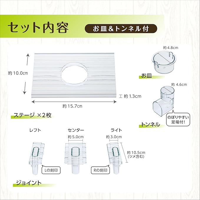 <製品サイズ>約幅42.5 奥行10.5 高さ8.5cm ケージ底からステージまでの高さ:約6.8cm <セット内容>ステージ 2枚、ジョイント(レフト、センター、ライト)、お皿、トンネル